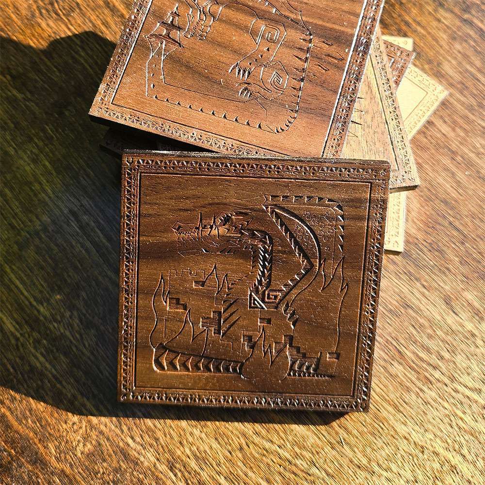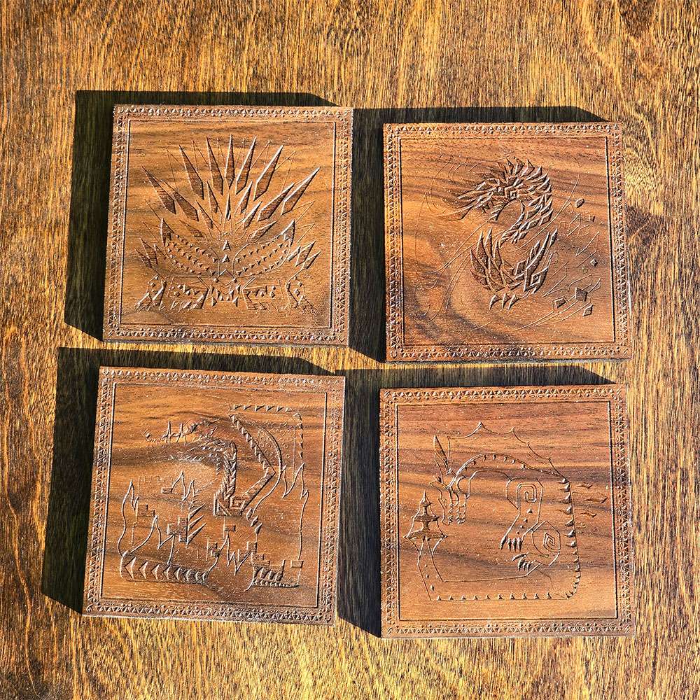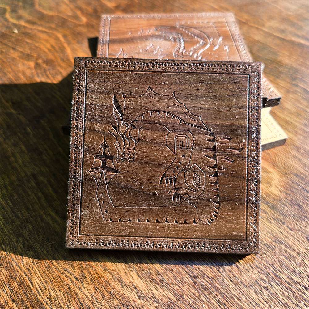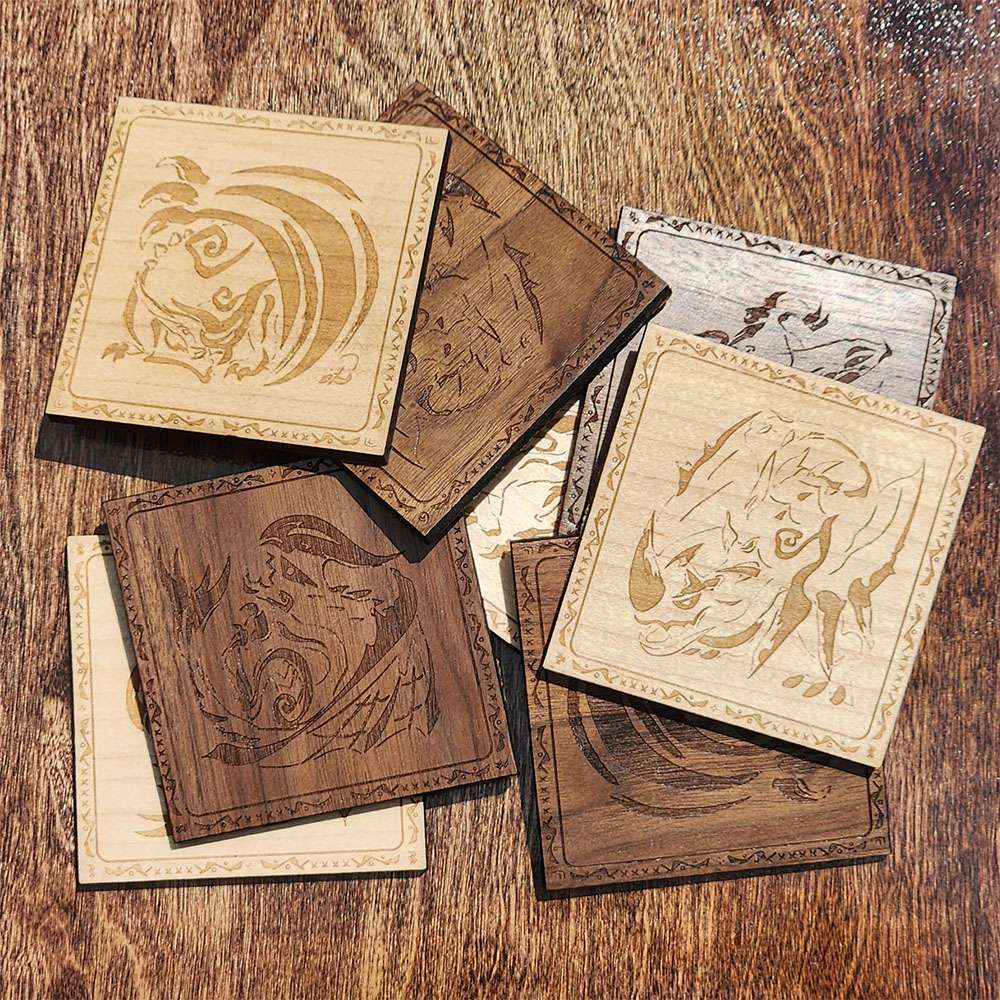 These modern coasters are made of from natural wood, bottomed with cork to protect any delicate surfaces you would every want to rest your drinks on. Featuring a highly water resistant coating they are made to be durable and easy to clean.Choose from one of the four fearsome beast or grab the whole set at a better price. Featuring illustrations of the Elder Dragon Hunter Nergigante, Cataclysmic Fatalis, Unstable Alatreon, and Lord of the Seas LagiacrusOptions in either Maple or Walnut woods*Can be made in Red Oak on request in same style as series 1-3.