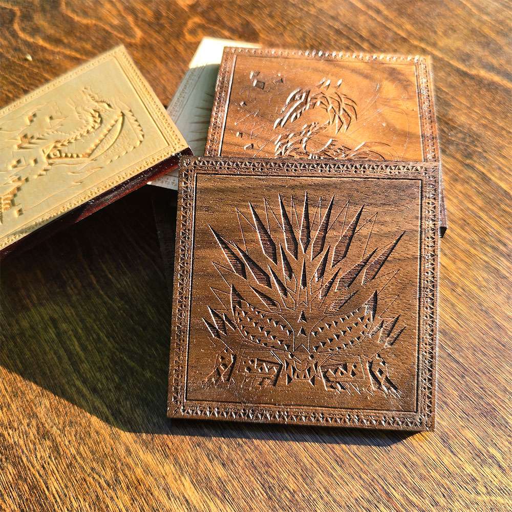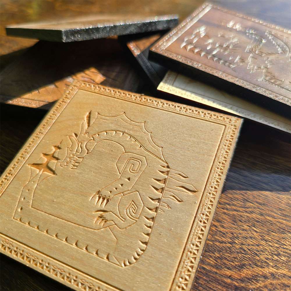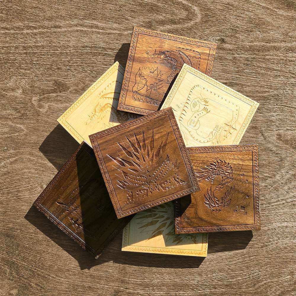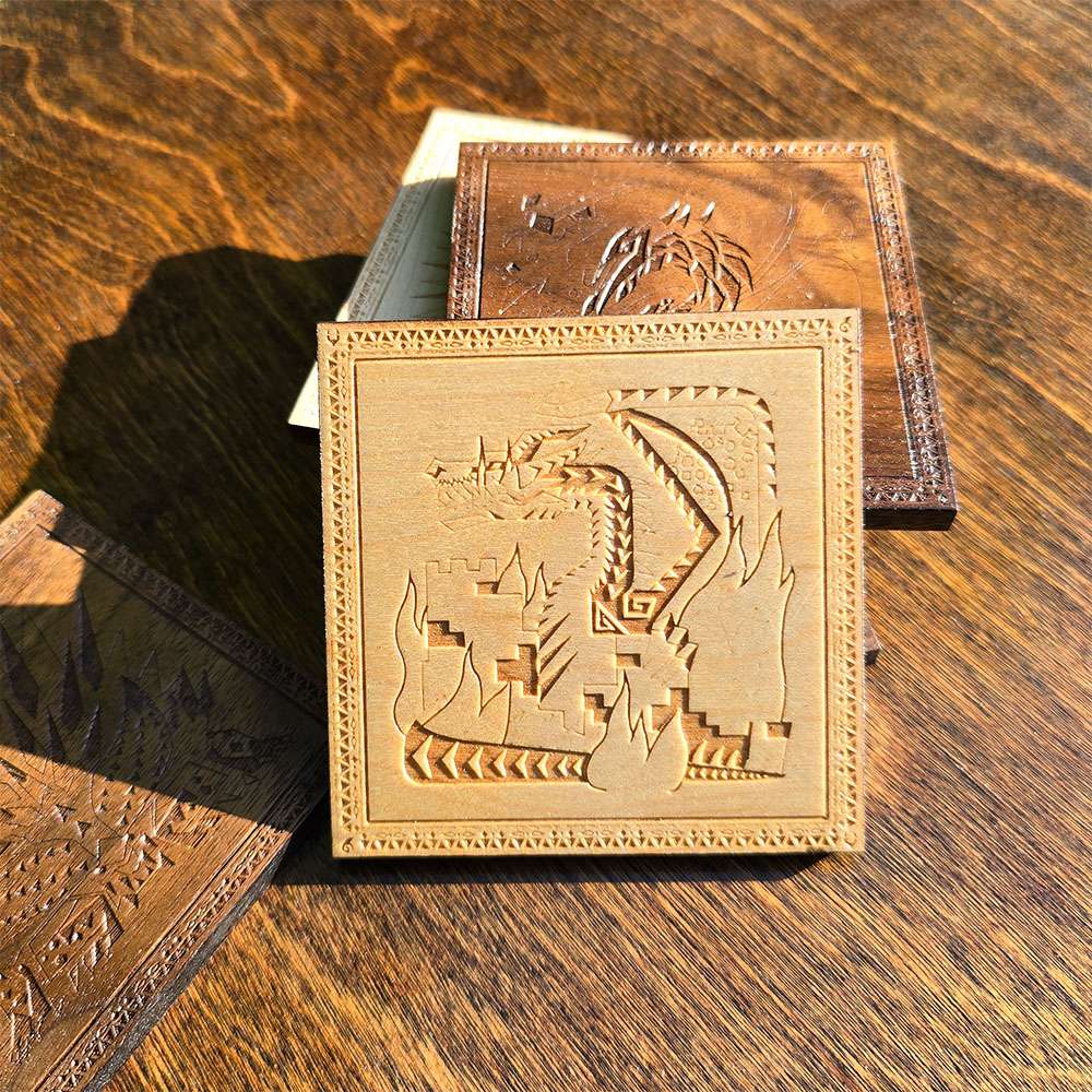 These modern coasters are made of from natural wood, bottomed with cork to protect any delicate surfaces you would every want to rest your drinks on. Featuring a highly water resistant coating they are made to be durable and easy to clean.Choose from one of the four fearsome beast or grab the whole set at a better price. Featuring illustrations of the Elder Dragon Hunter Nergigante, Cataclysmic Fatalis, Unstable Alatreon, and Lord of the Seas LagiacrusOptions in either Maple or Walnut woods*Can be made in Red Oak on request in same style as series 1-3.